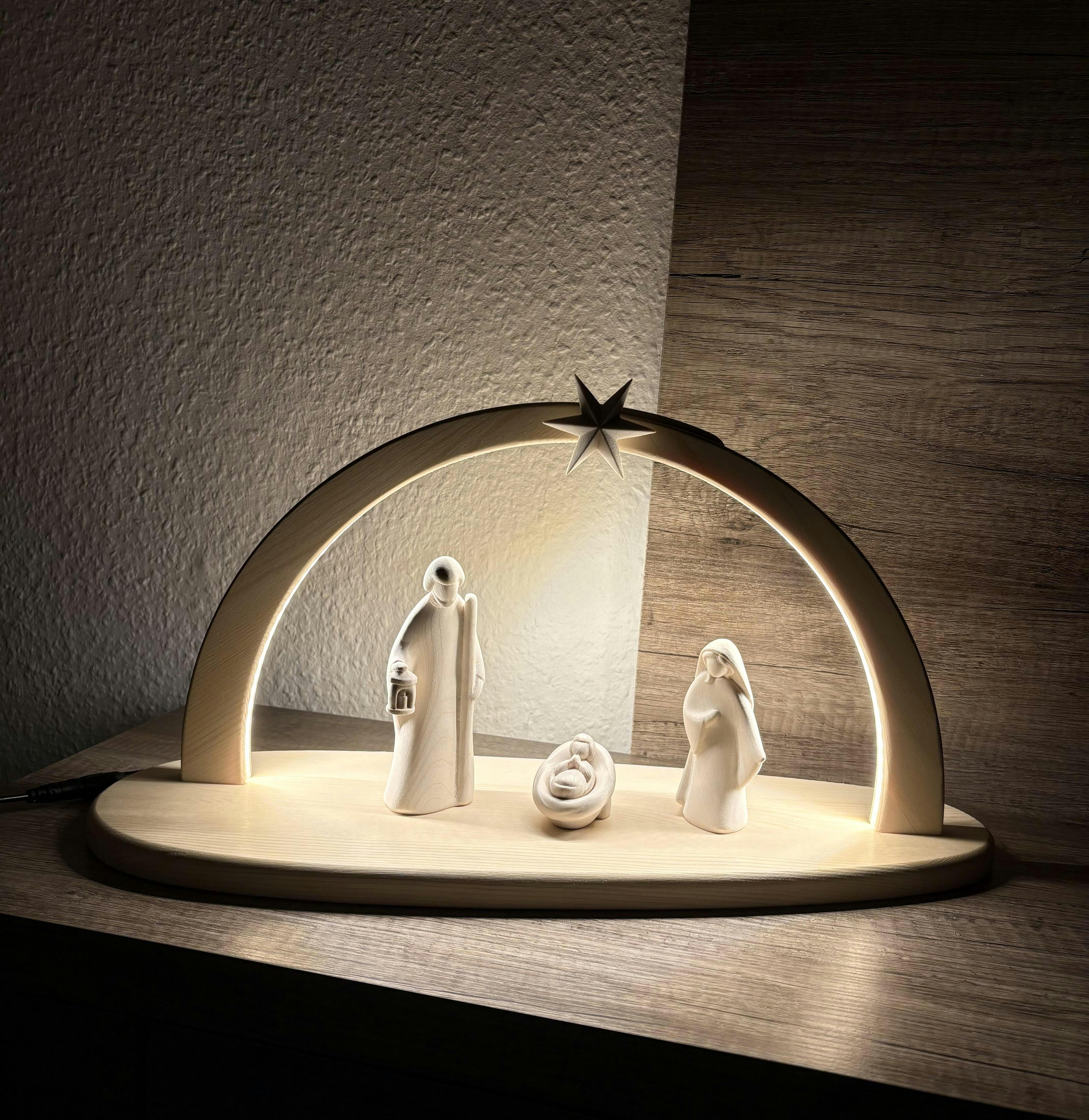 Das Leonardo Krippen-3er-Set beinhaltet die Heilige Maria, den Heiligen Josef, das Jesuskind und einen beleuchteten Stall. Diese Kollektion umfasst die drei wichtigsten Figuren einer traditionellen Weihnachtskrippe sowie den Geburtsstall Jesu. Diese Krippenfiguren wurden mit äußerster Liebe zum Detail gestaltet und sind aus edlem, hochwertigem Bergahornholz handgeschnitzt.